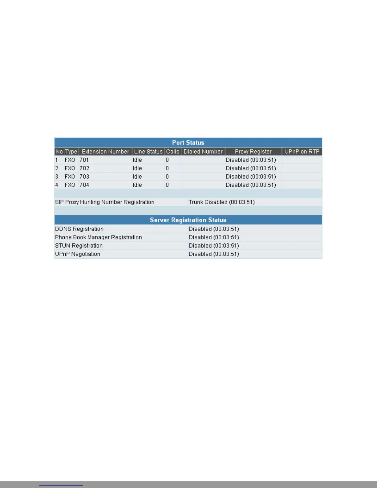 Port Status: it includes if each port registers to Proxy successfully, the last dialed number, how many calls