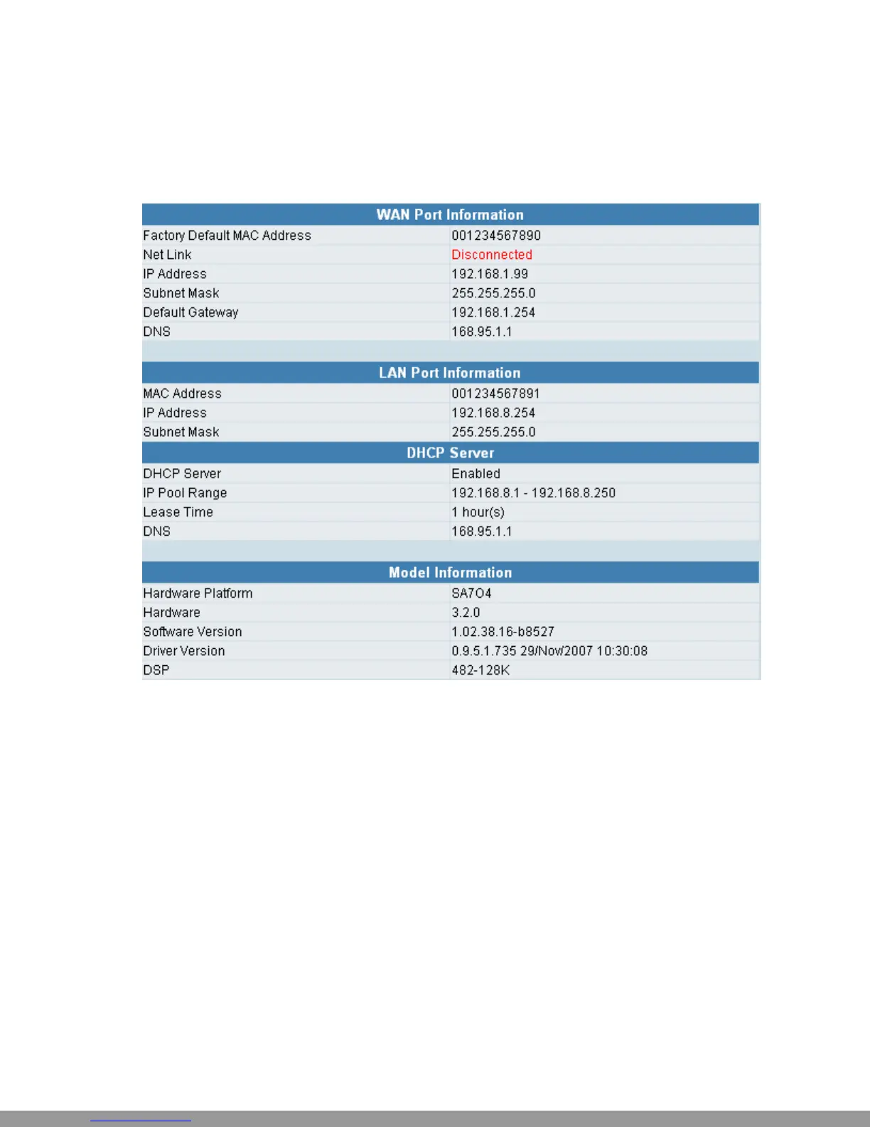 y LAN Port Information: It shows LAN port IP, subnet mask, and the status of DHCP server.