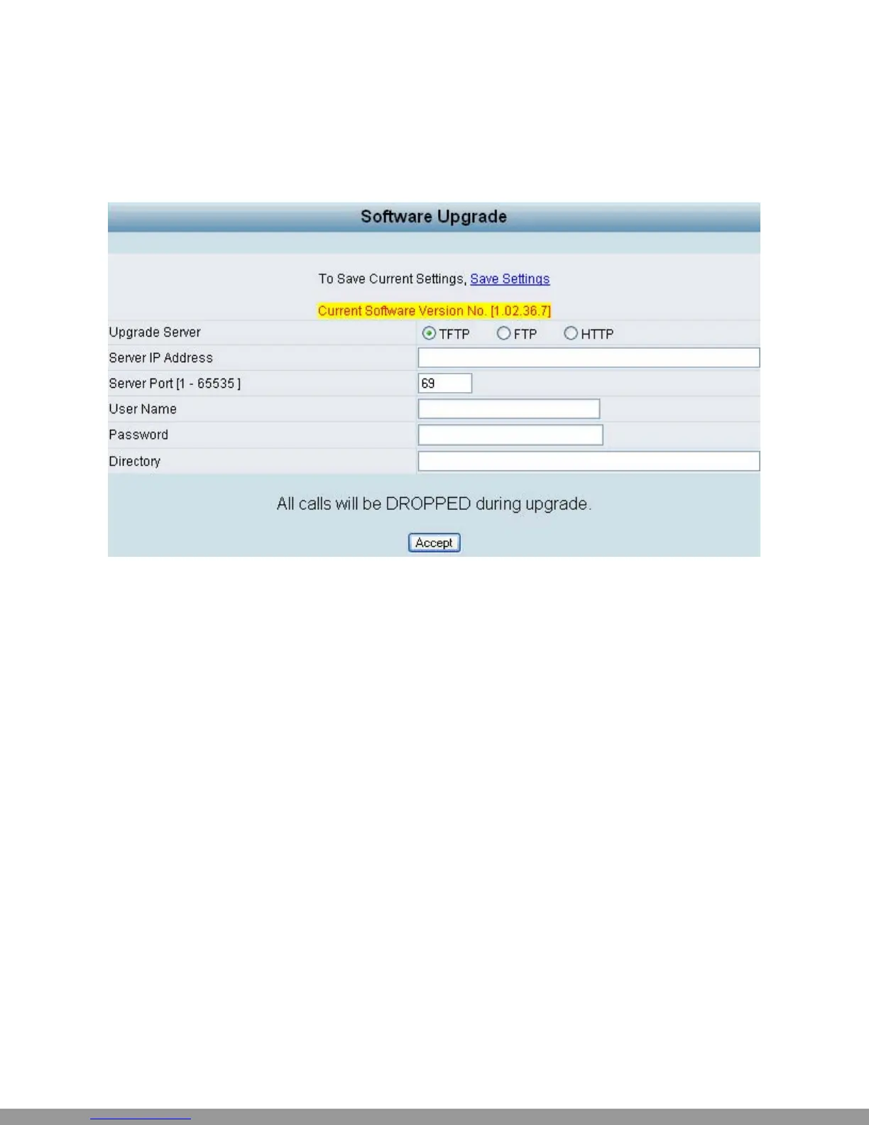 y Software Upgrade Server Port: Enter the port that the server uses. TFTP is 69, and FTP is 21.