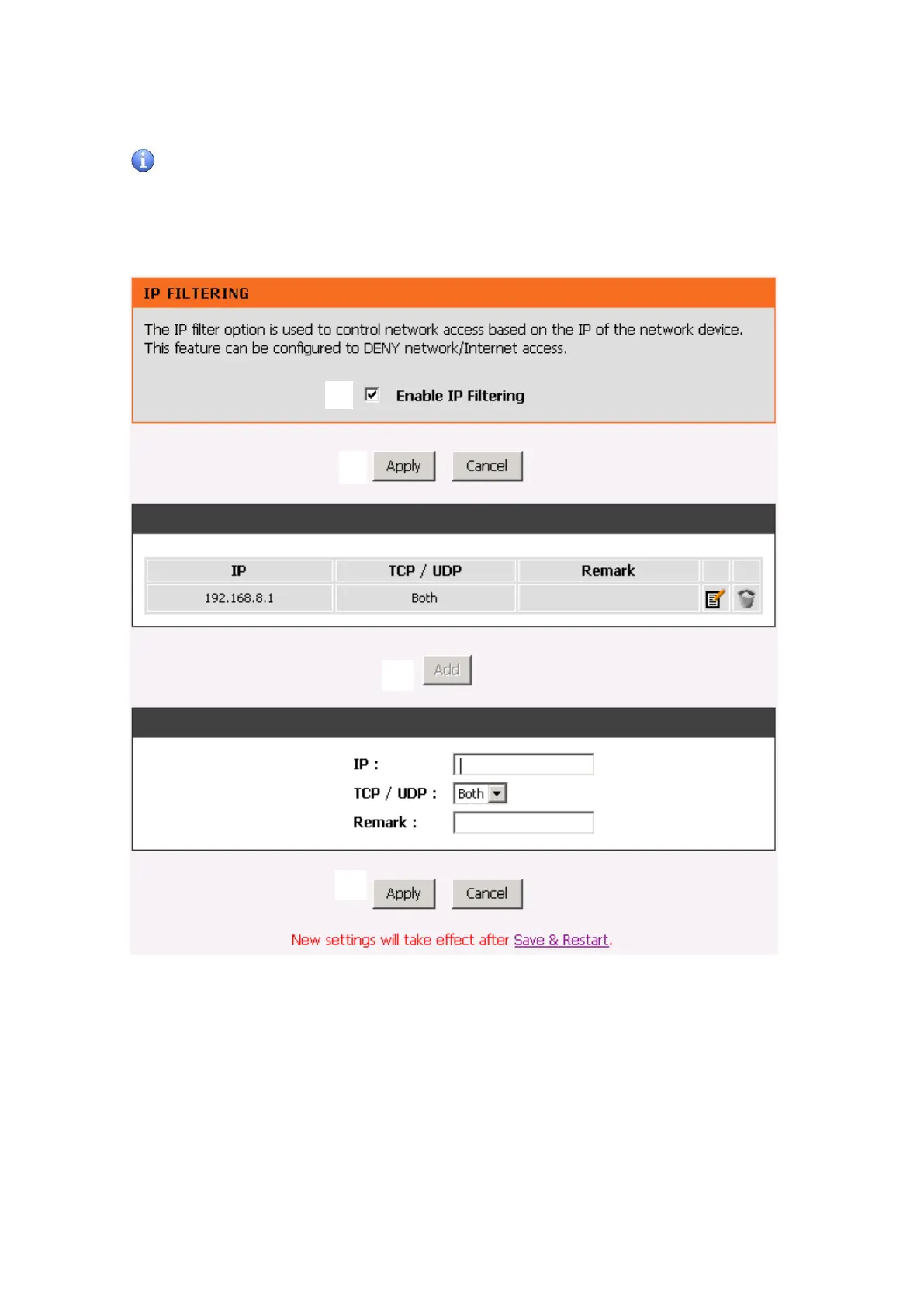 1. Click “Enable IP Filtering” check box to open the main screen.