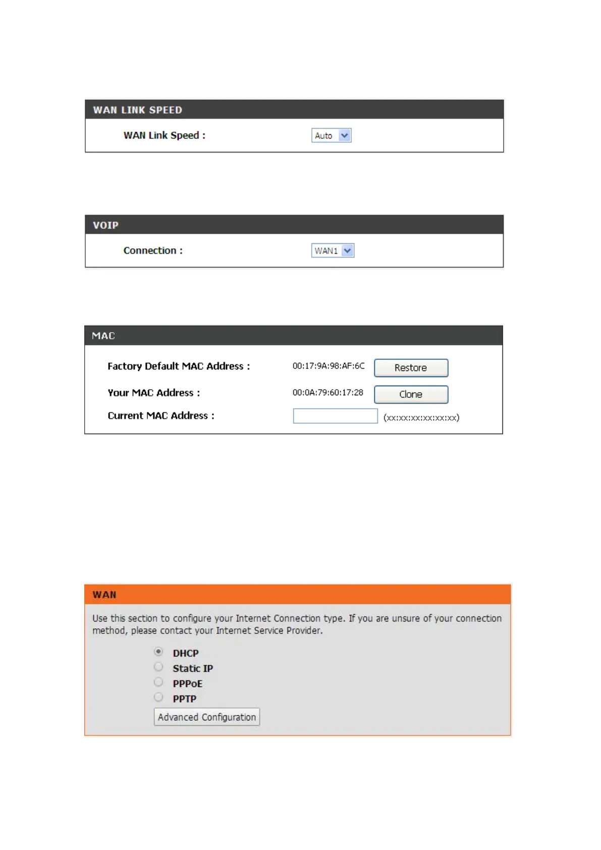 Factory Default MAC Address: The original MAC address of the VoIP Router.