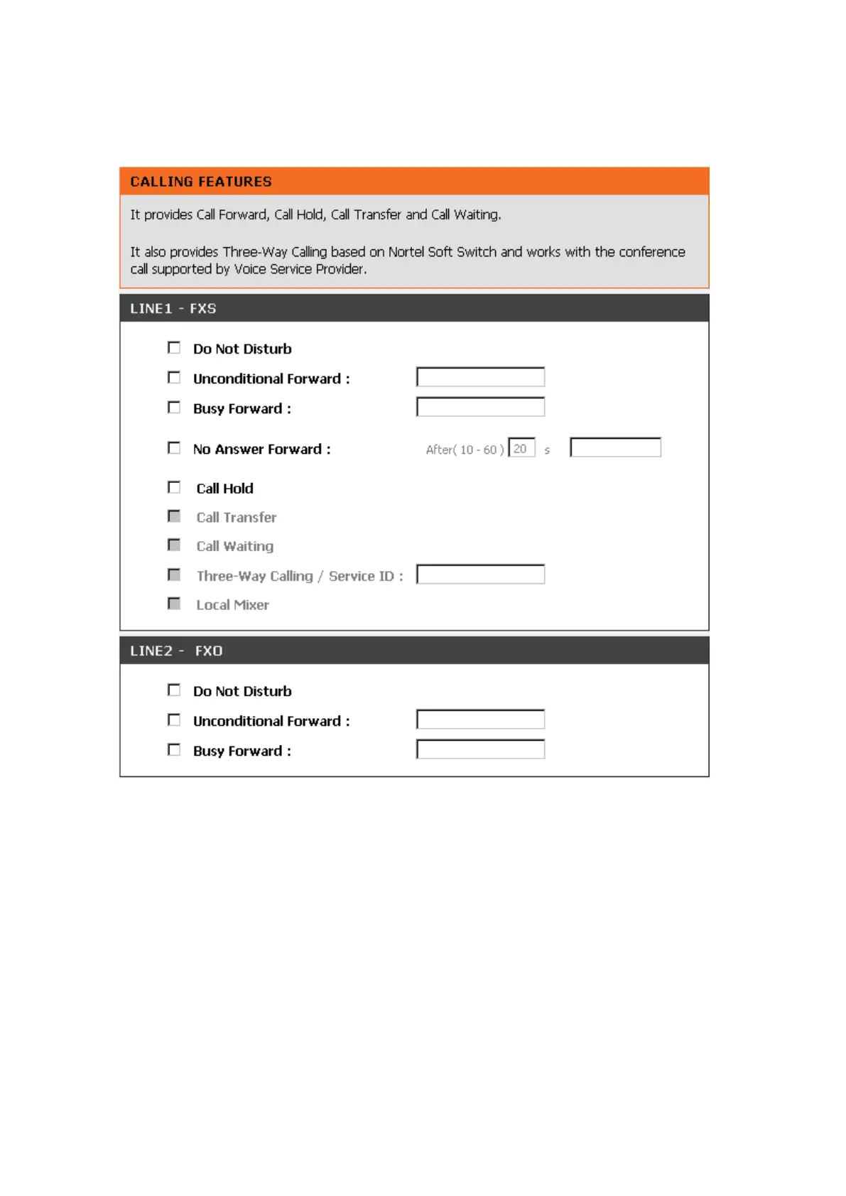 Call Waiting: Check the box to accept incoming call while talking (FXS port only).