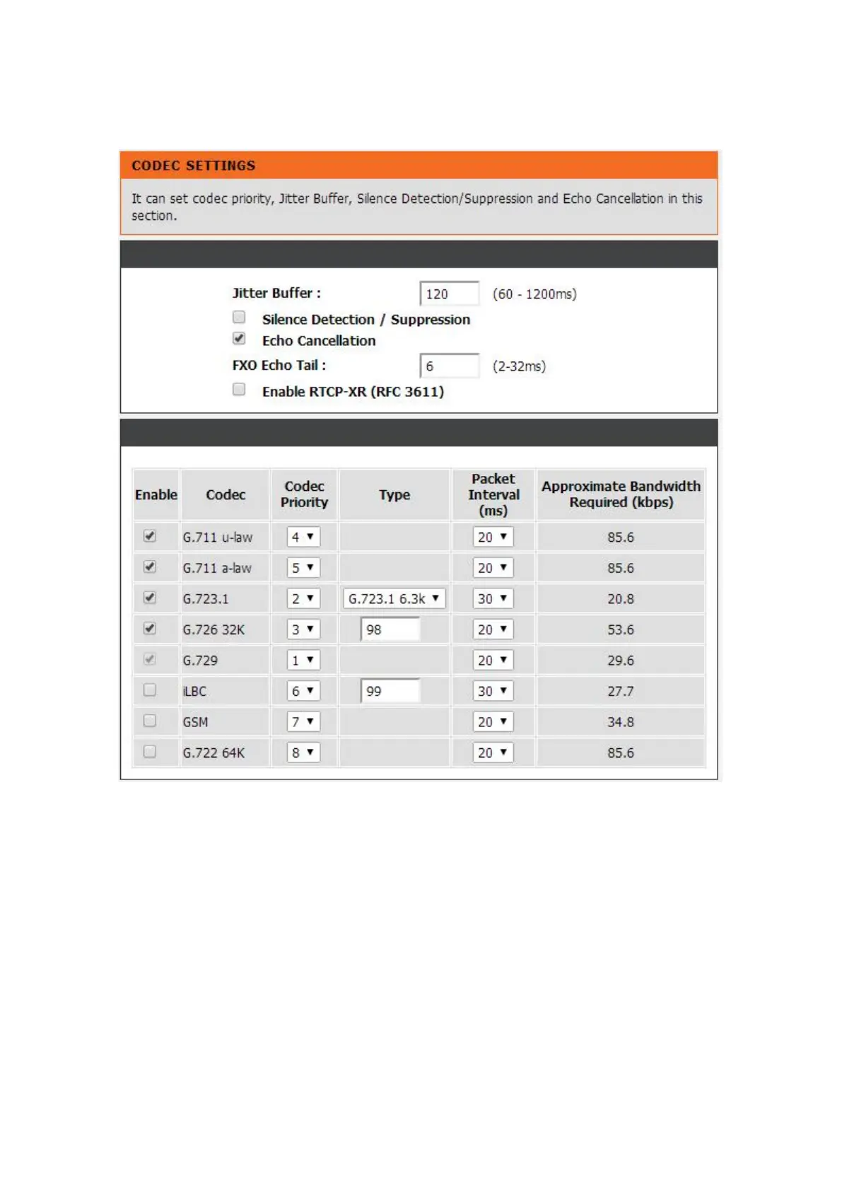 Codec: Check the box to codec for the VoIP TA to support. All codecs are selected and supported by