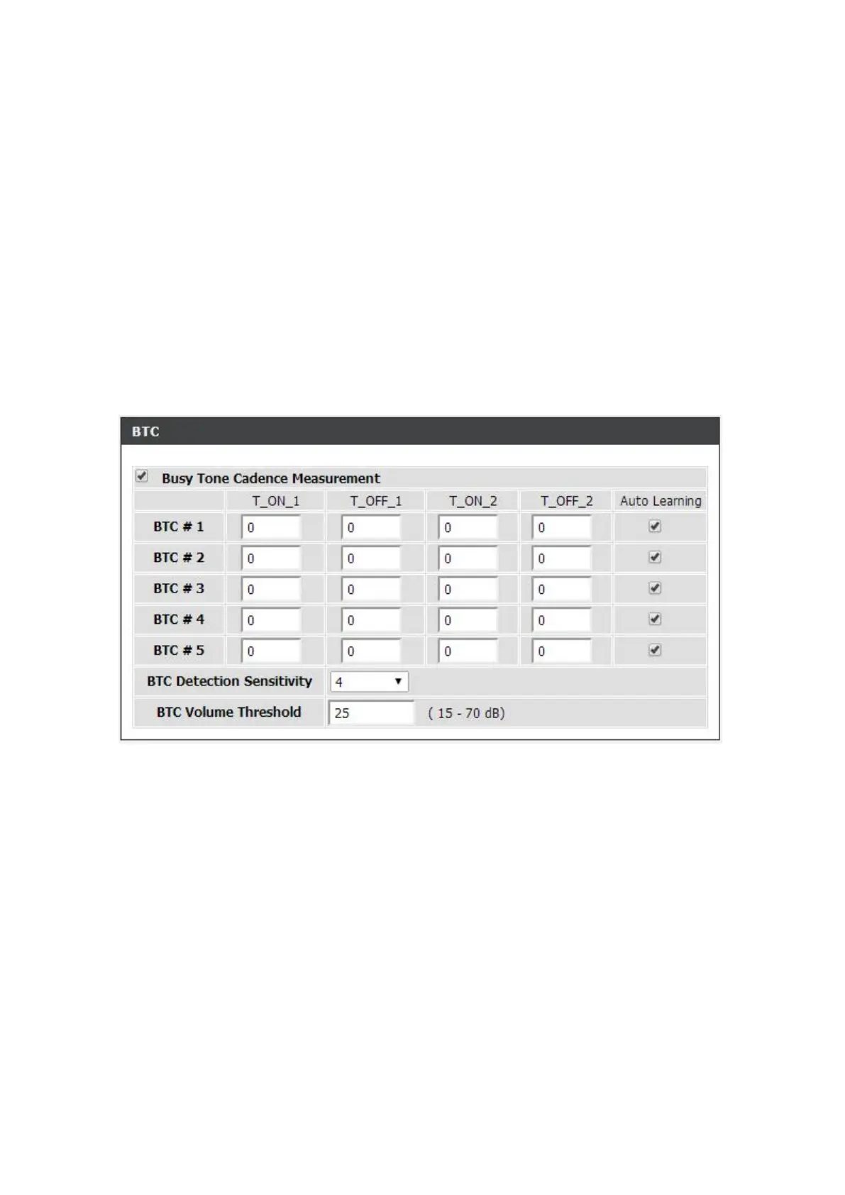 BTC Volume Threshold: The detective level for busy tone cadence measurement.