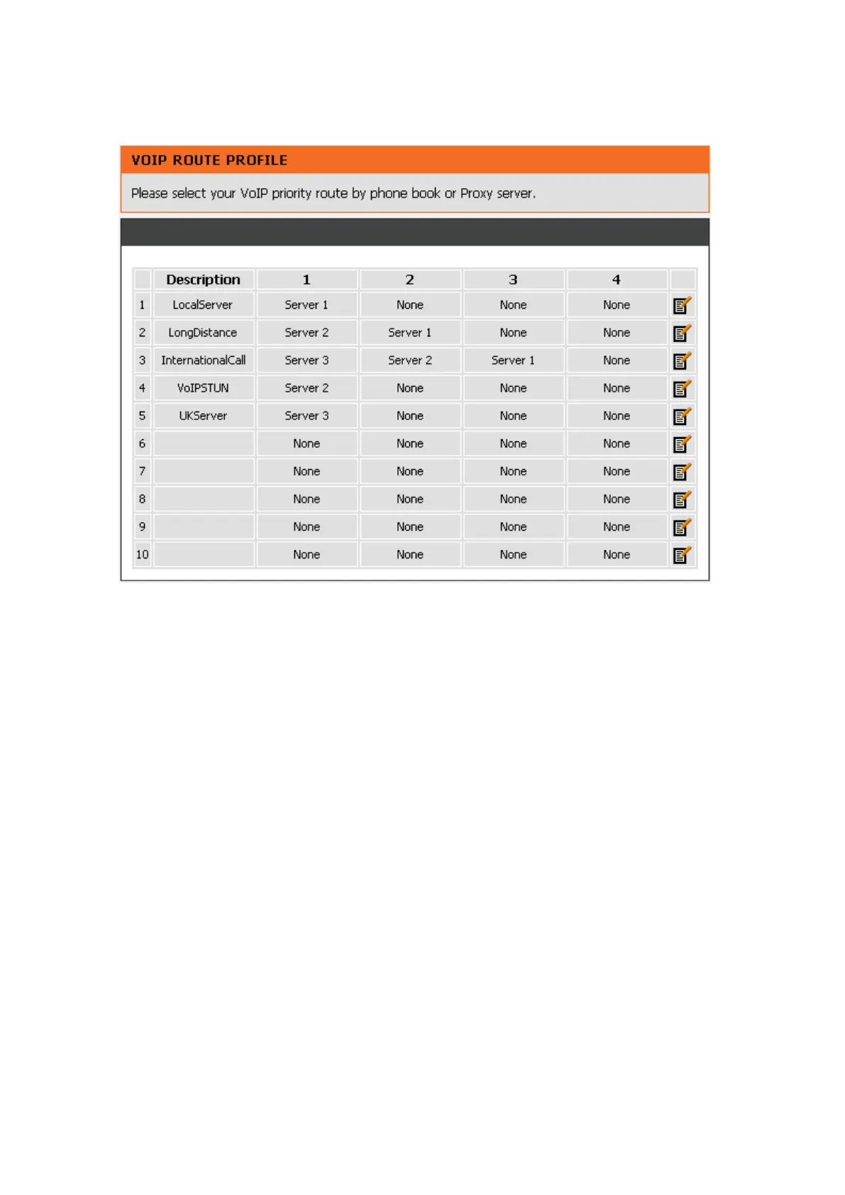There are 10 VoIP route profiles. Each VoIP route profile provides four routes to select. Server 1,