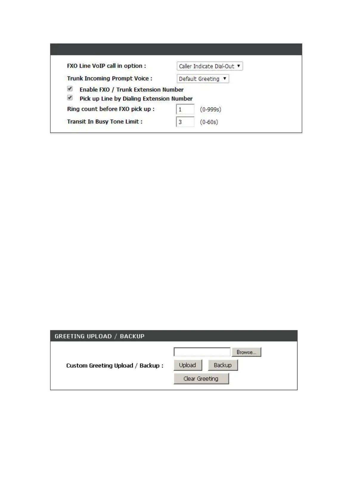 Trunk Incoming Prompt Voice: Select the greeting when FXO receives an inbound call (transit in).