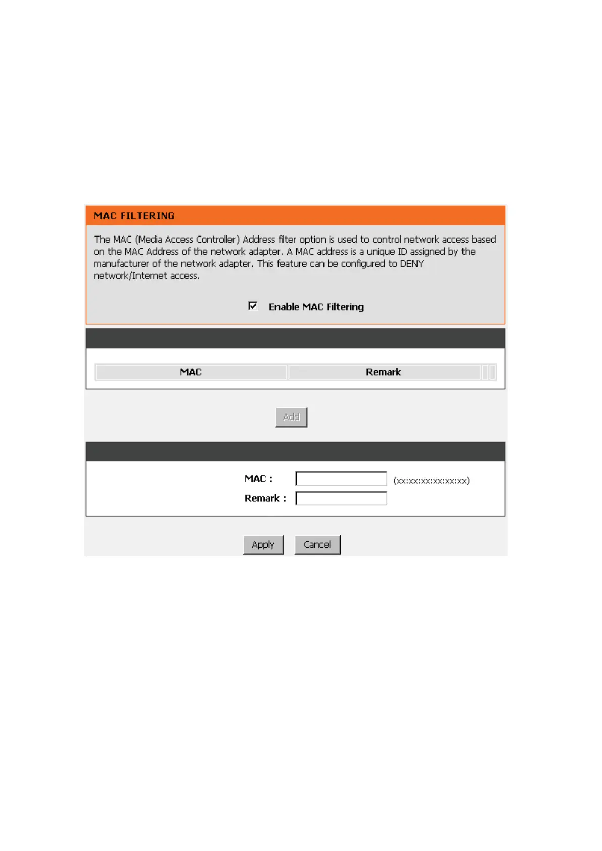 Enable MAC Filtering: Check the box to deny from accessing Internet.