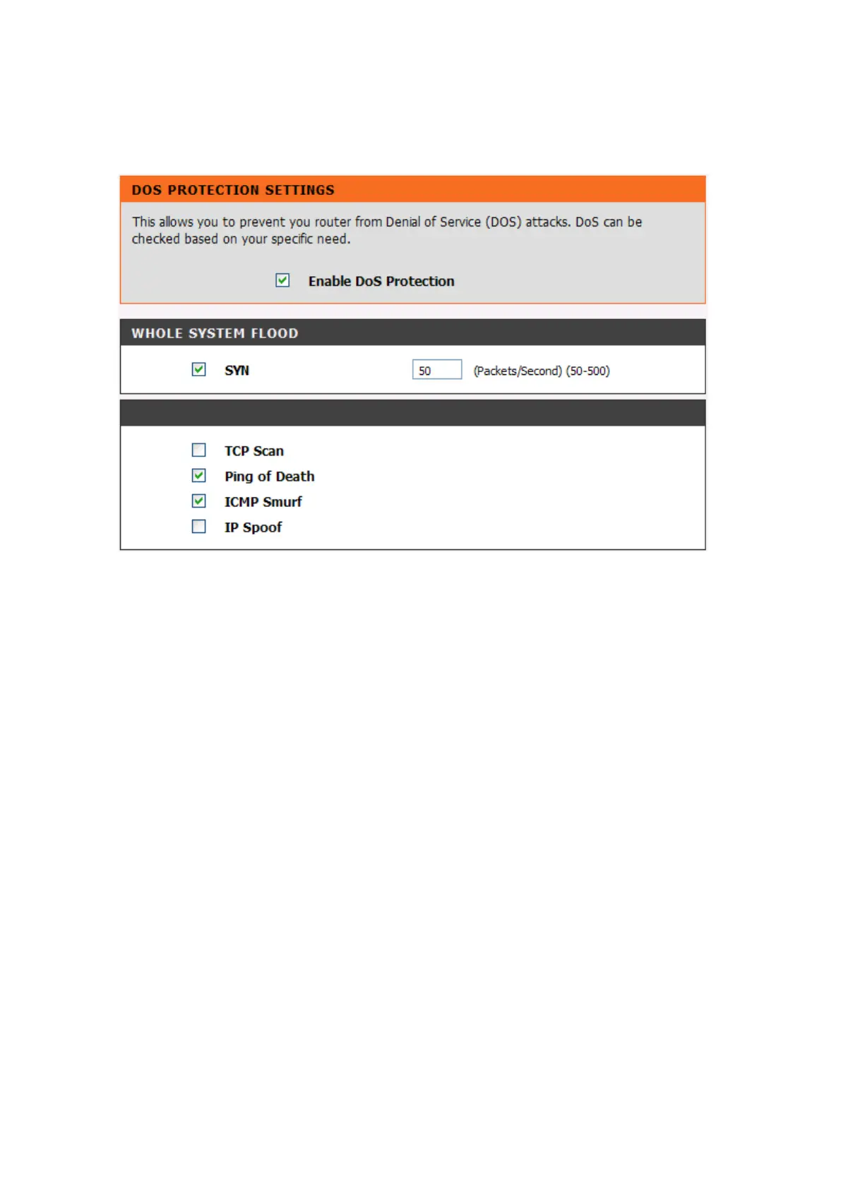 Enable DoS Prevention: Check the box to prevent DoS attacks from WAN or LAN. There are various