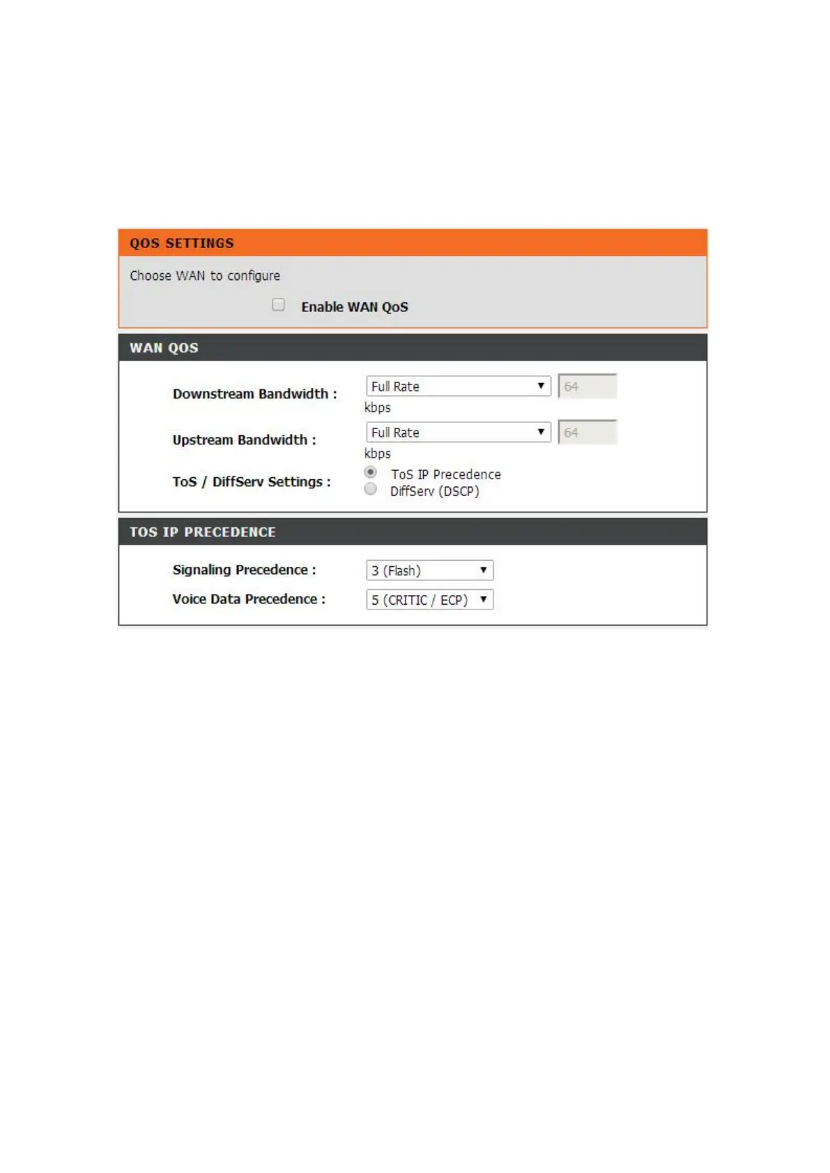Enable WAN QoS: Check the box to guaranty the voice quality. The system reserves the bandwidth for