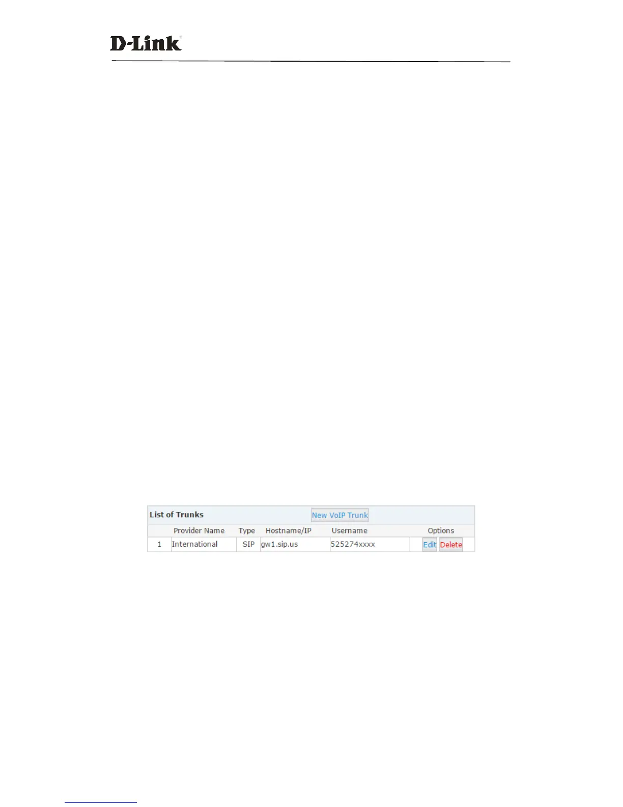 By clicking “Edit” you can modify the trunk settings and by clicking “Delete” you can remove this