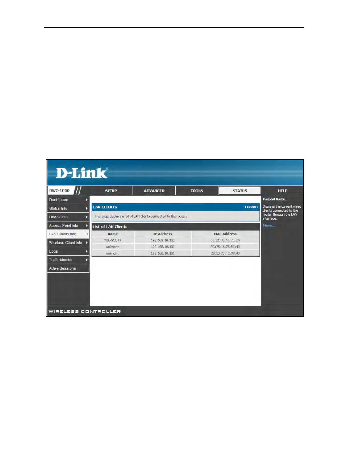 scan through the LAN controller. The LAN CLIENTS page shows the: