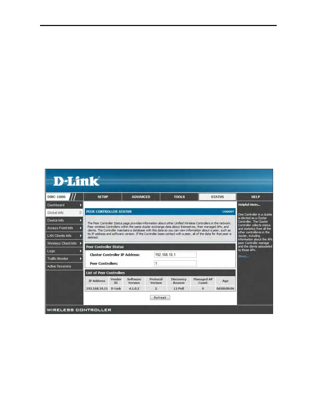 The PEER CONTROLLER STATUS page provides information about other wireless