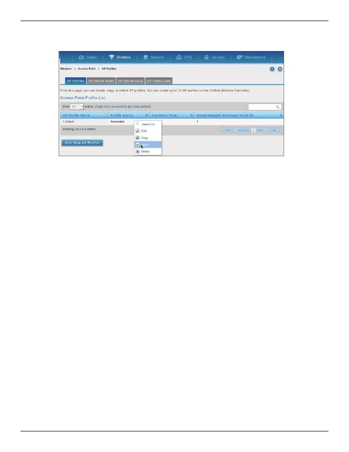 10. Now, go to Wireless > Access Point > AP Proles page, right click the AP Prole and click Apply to push