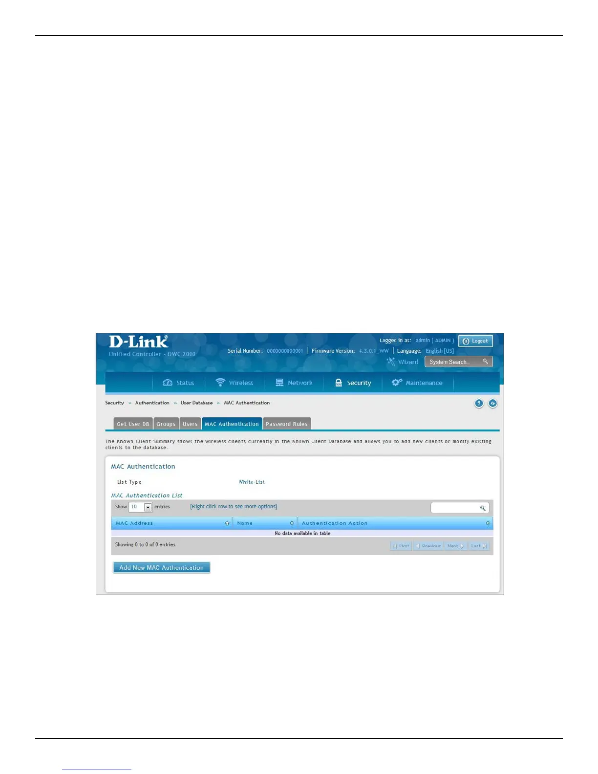 Using the MAC Authentication page, you can view wireless clients in the MAC Authentication database. The