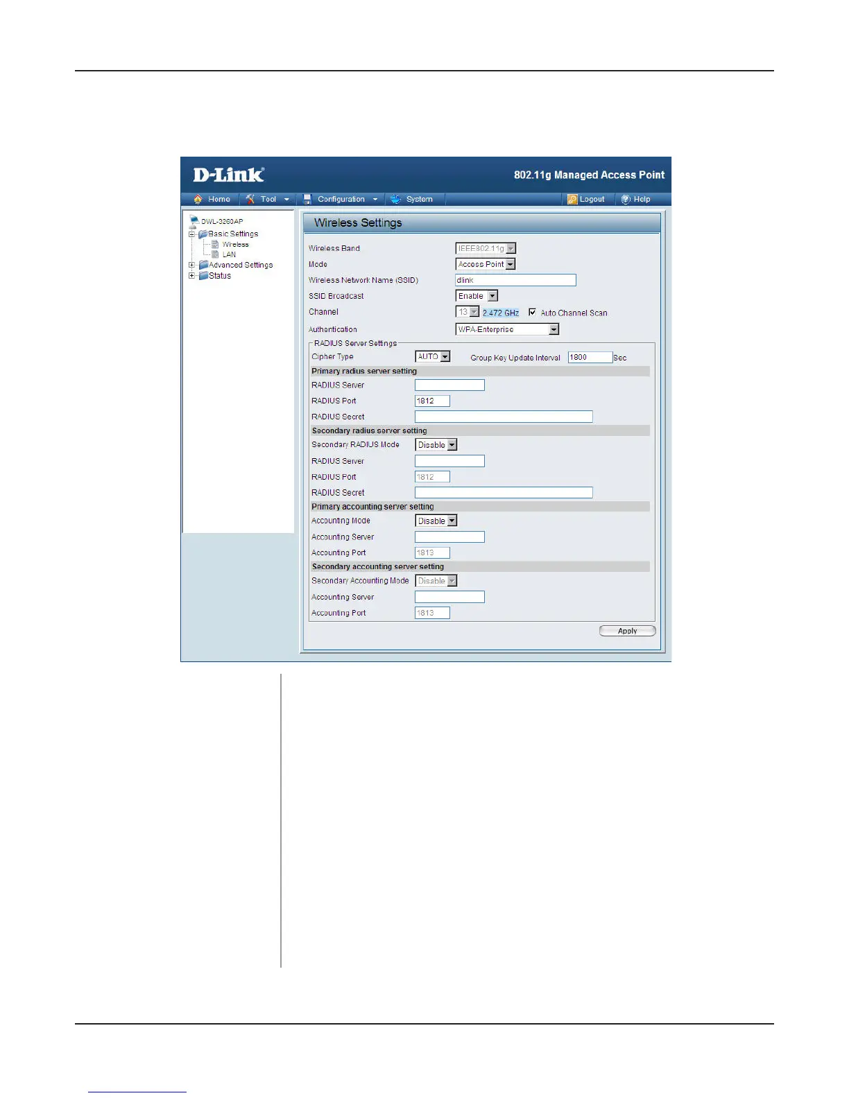 Home > Basic Settings > Wireless > WPA-Enterprise, WPA2-Enterprise, &