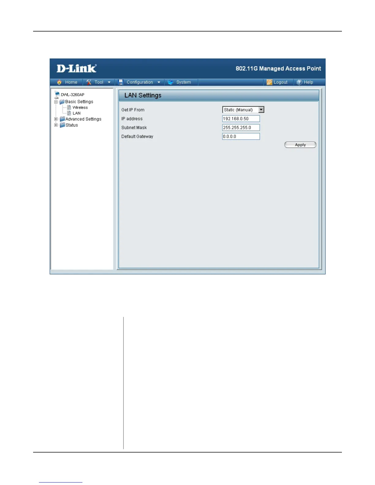 settings of the LAN interface for the DWL-3260AP. These settings may be referred to as private