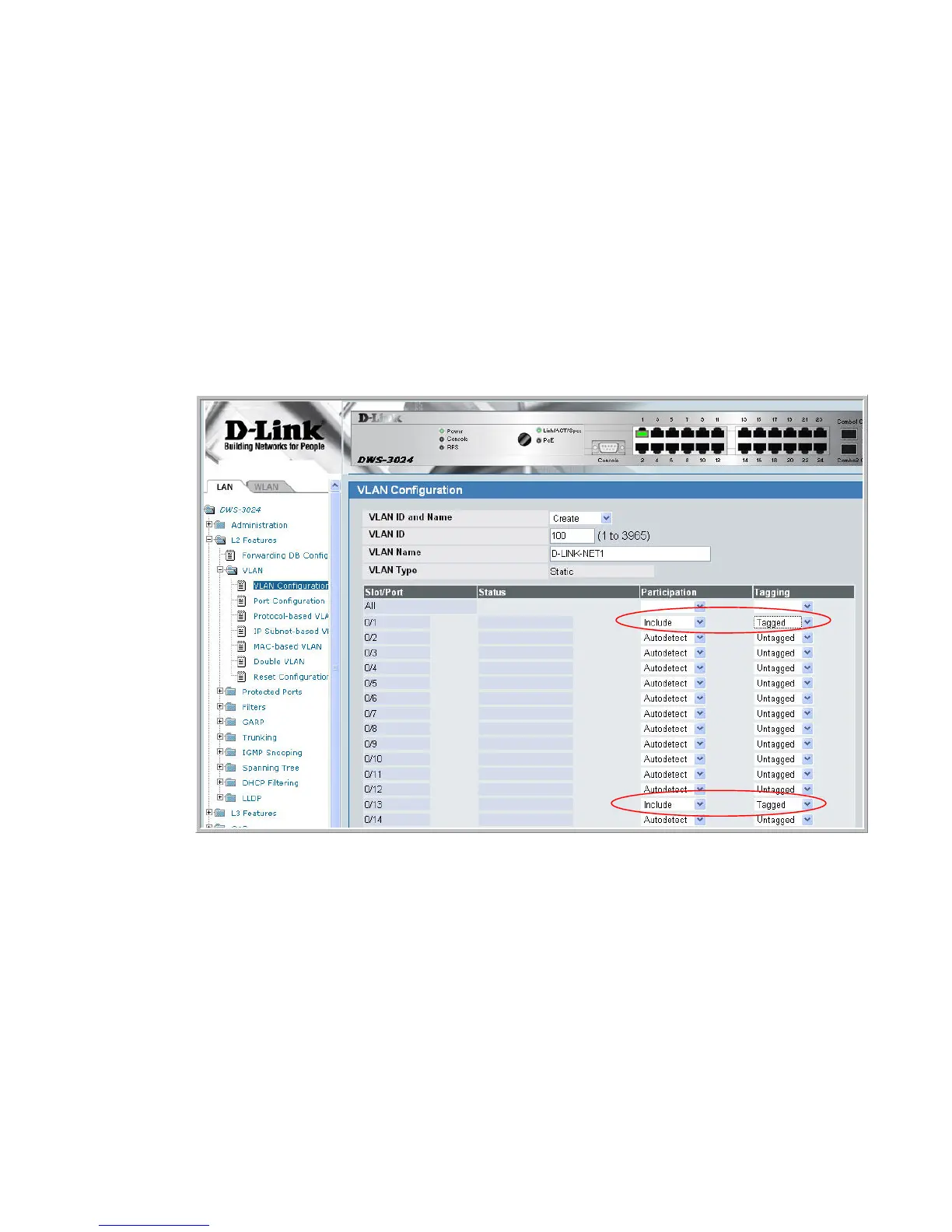 5. On the Slot/Port row for the port to include in the VLAN, select Include from the