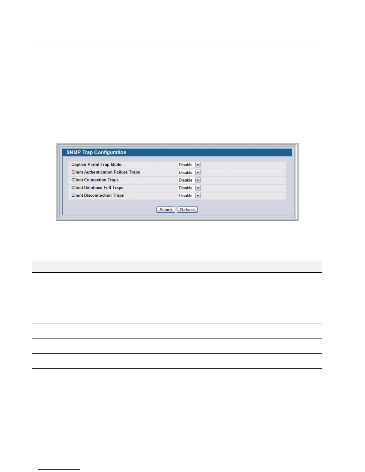 Use the SNMP Trap Configuration page to configure whether or not SNMP traps are sent from the Captive Portal and to