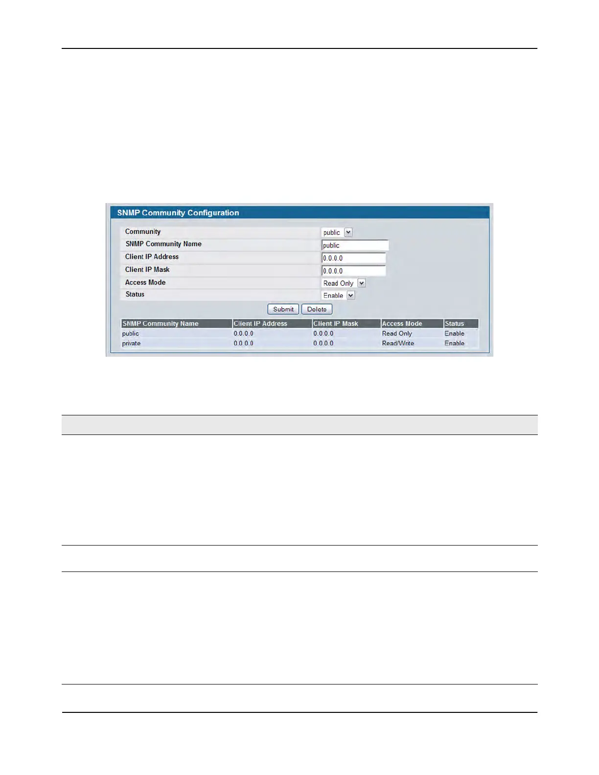 Access rights are managed by defining communities on the SNMPv1, 2 Community page. When the community
