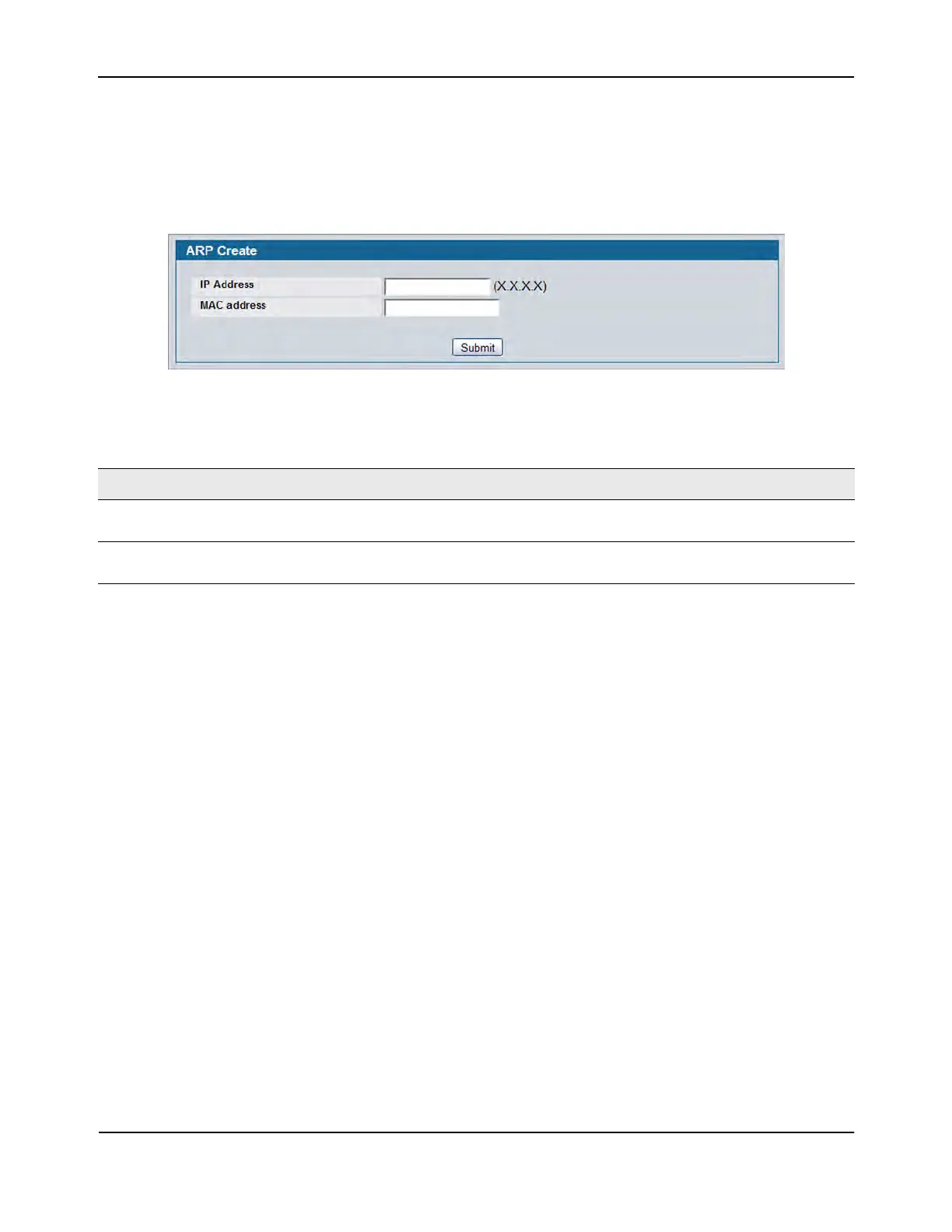 Use the ARP Create page to add an entry to the Address Resolution Protocol table.
