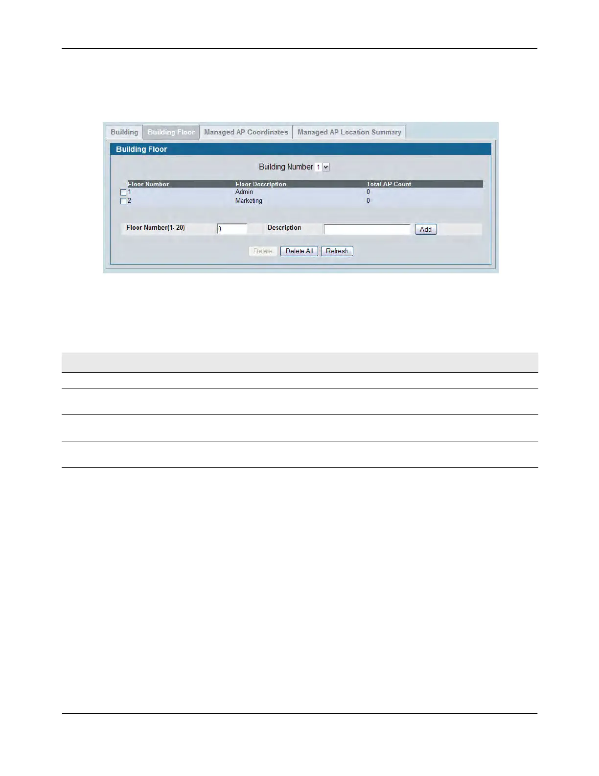 • Delete All—Deletes all configured floors from the building.