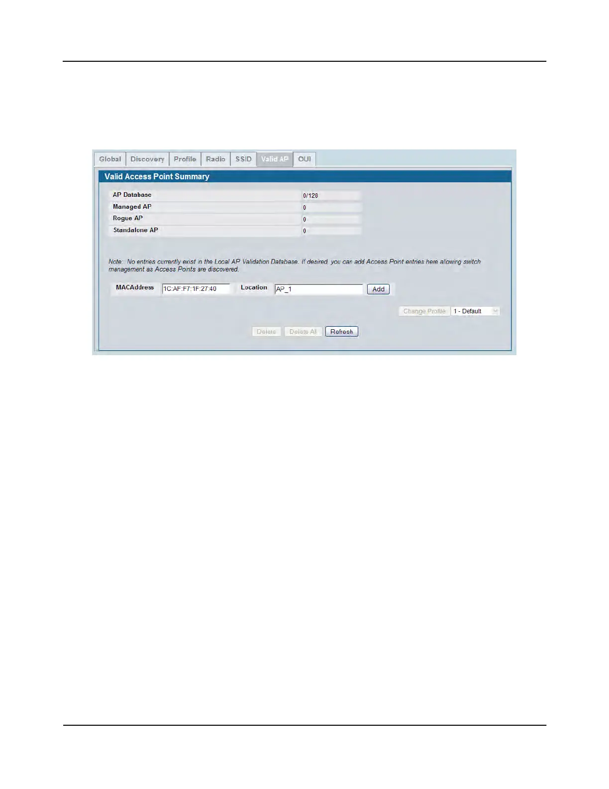 6. Add the AP to the Valid AP database so that it can become managed when the switch discovers it.