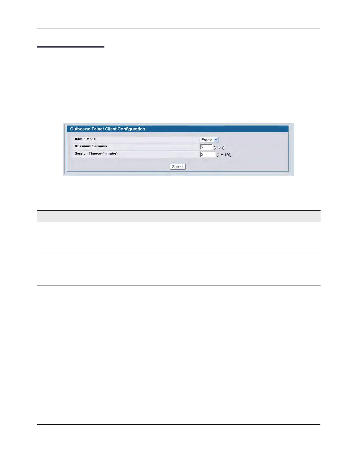 Session Timeout Specifies the Outbound Telnet login inactivity timeout. The default value is 5.