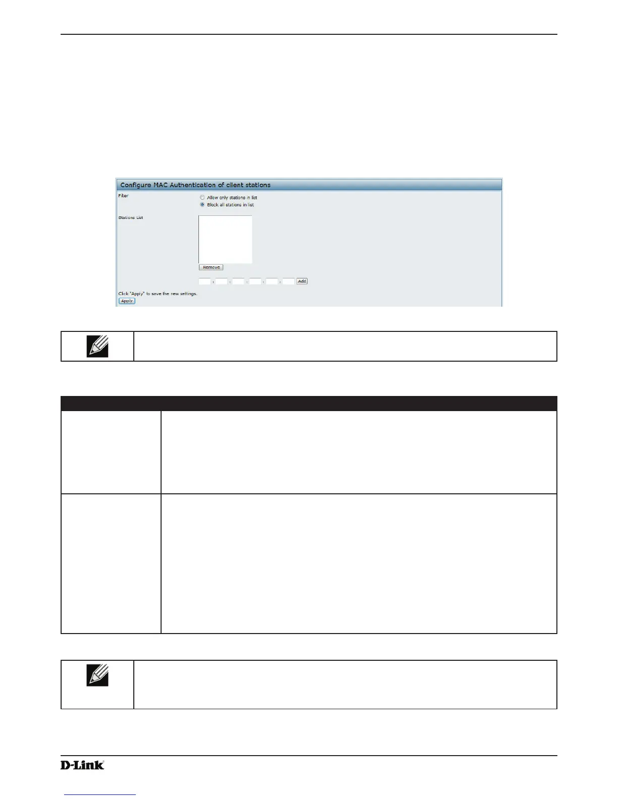 set the îšżlter, you can allow only client stations with a listed MAC address or deny access to the stations listed.