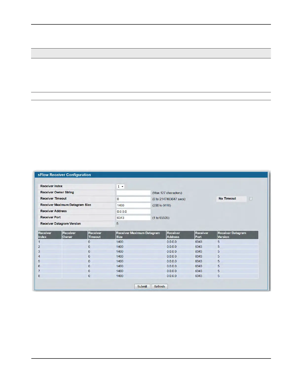 Use the sFlow Receiver Configuration page to configure the sFlow Receiver.