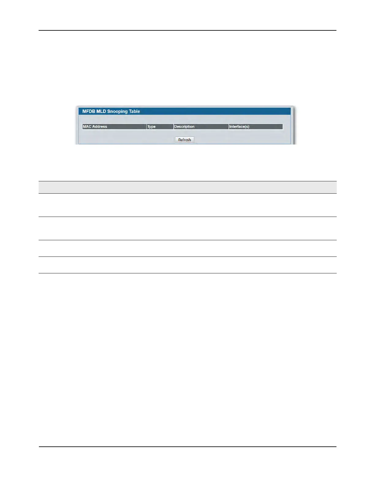 Use the MLD Snooping Table page to view all of the entries in the Multicast Forwarding Database that were