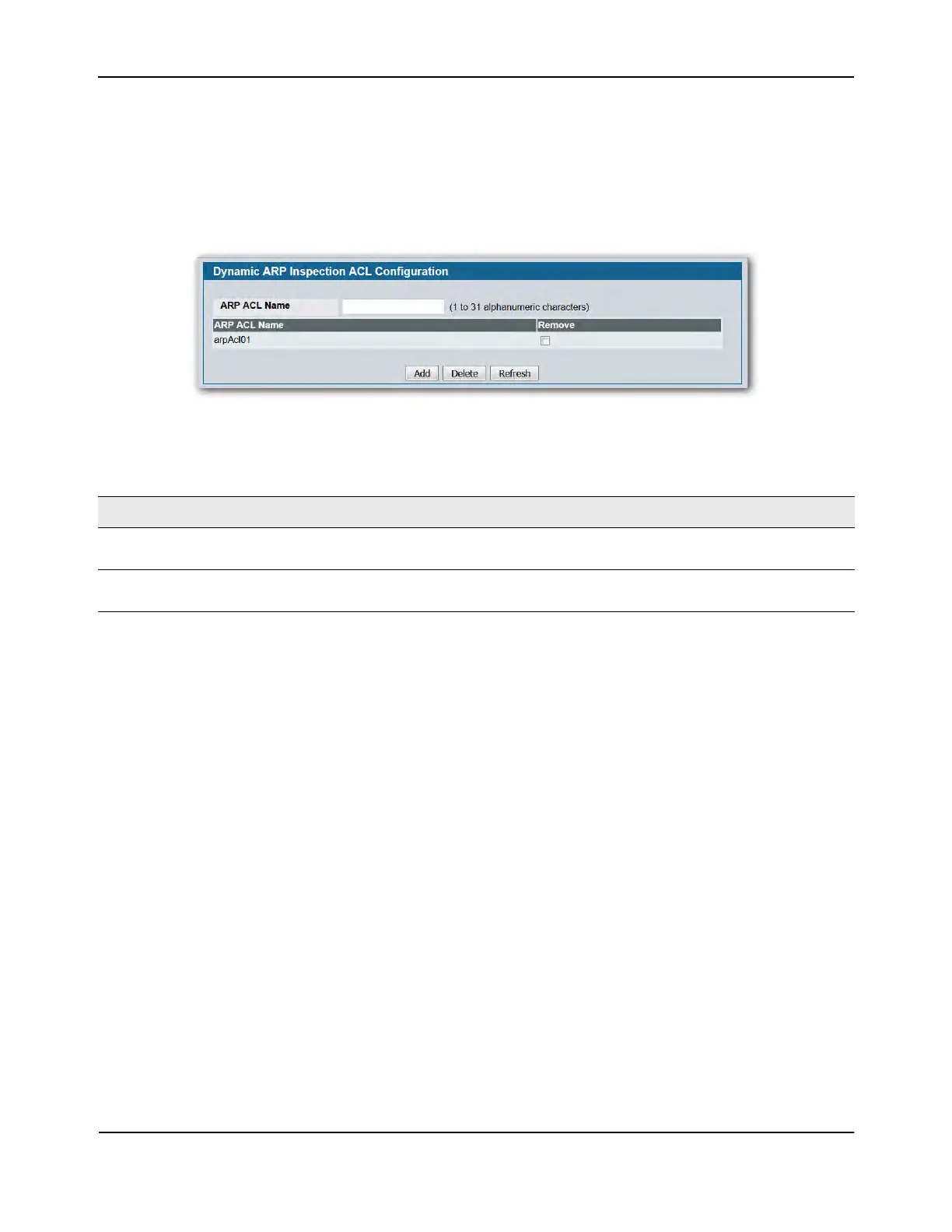 ARP ACL Name Use this field to create a new ARP ACL for Dynamic ARP Inspection. The name can be 1 to