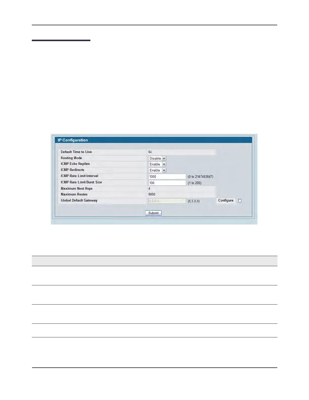 Use the IP Configuration page to configure routing parameters for the switch as opposed to an interface.