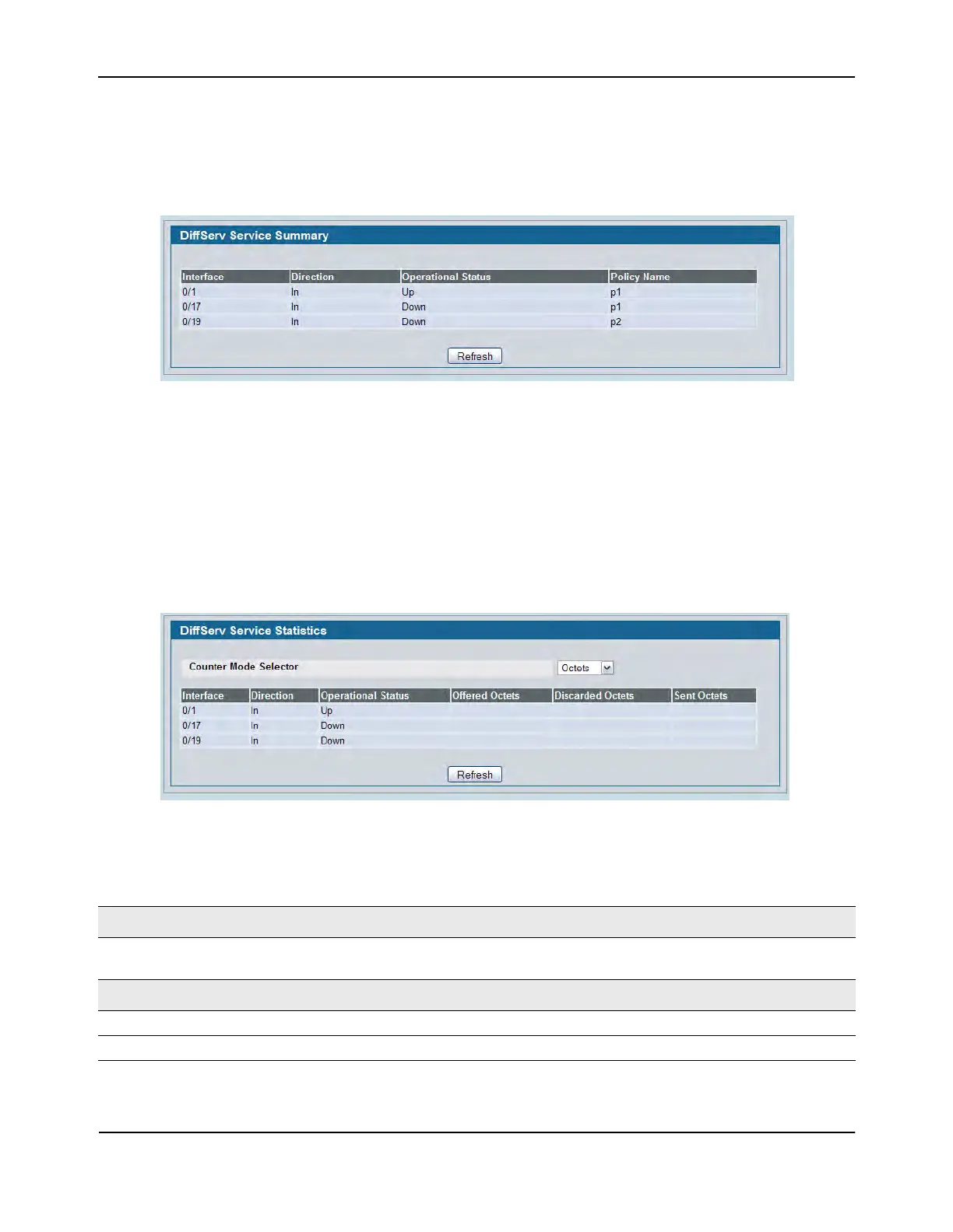 The DiffServ Service Summary page provides an overview of the policies-port associations. To display the page,
