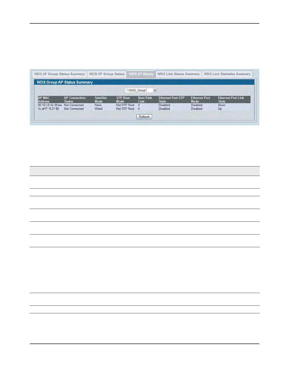 The WDS AP Group Status Summary page displays summary information about the APs in a configured WDS