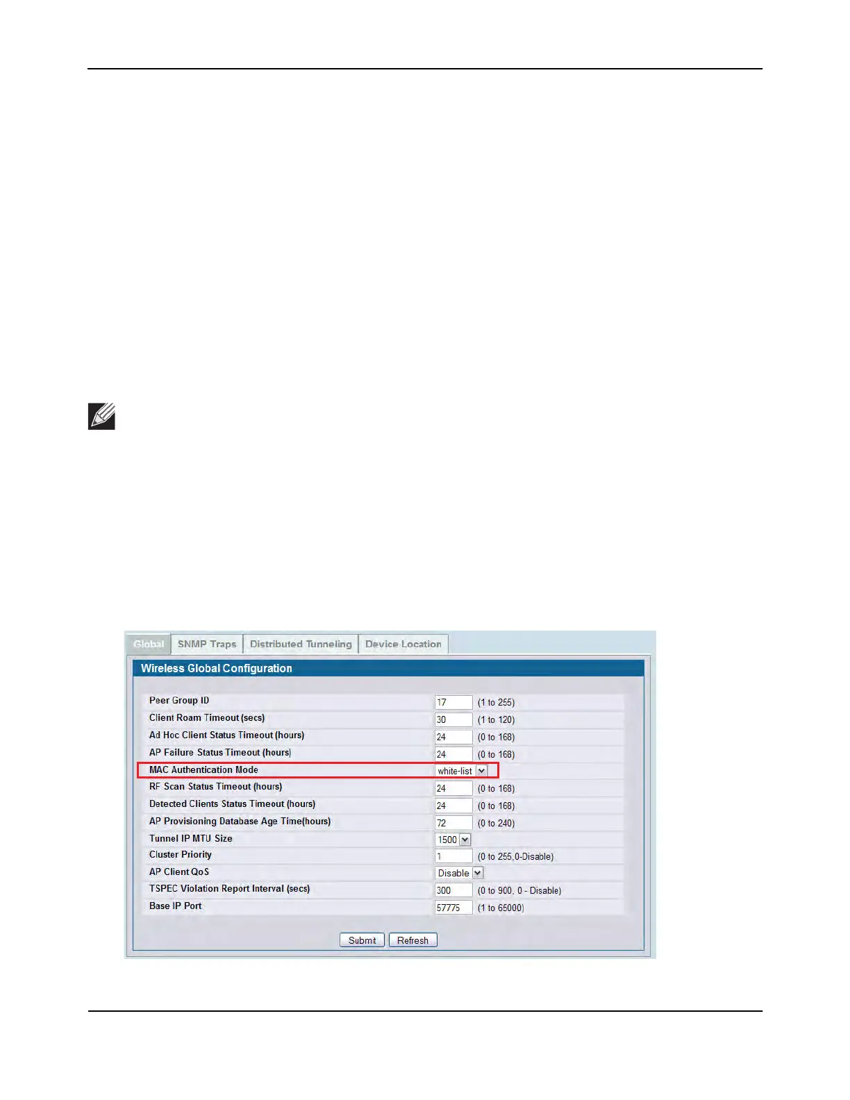 1. Verify the MAC Authentication mode is white-list on the WLAN > Administration > Advanced