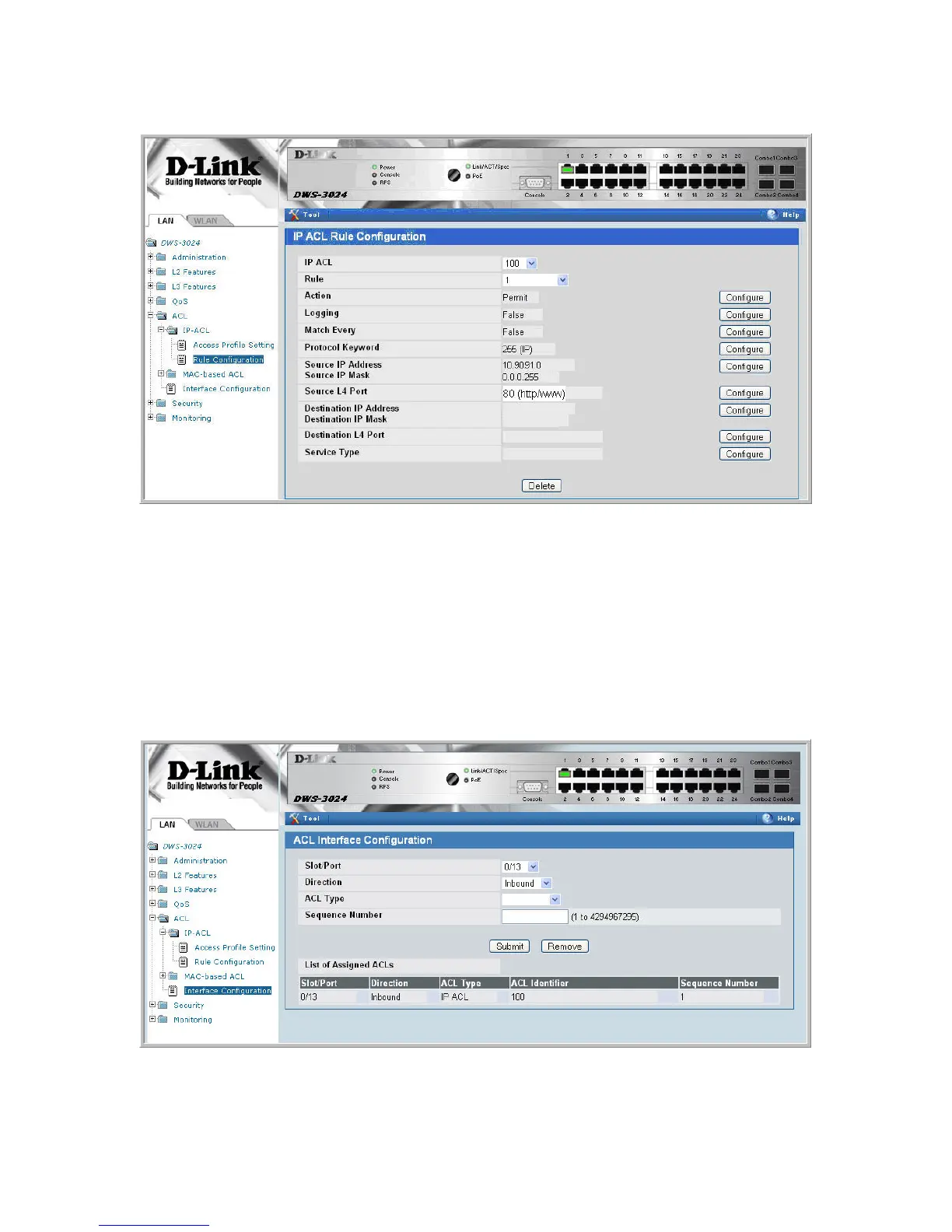 5. Repeat the steps to associate ACL 100 with port 0/13.