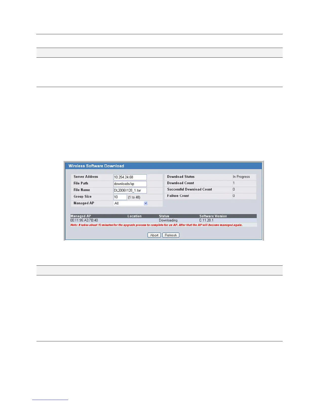 The software download could be aborted while the code transfer is in progress for any AP only during the time the Abort