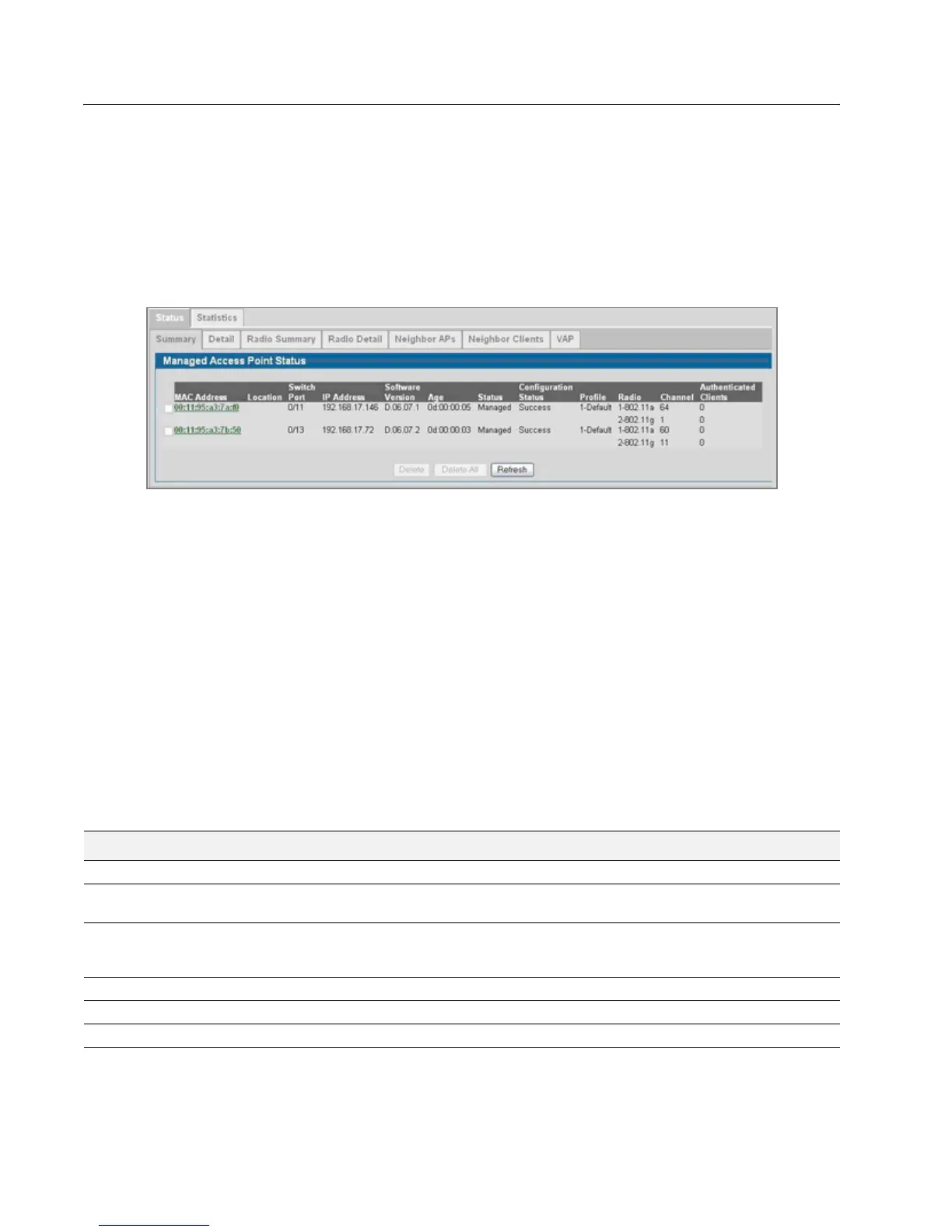 •Summary—Lists the APs managed by the switch and provides summary information about them.