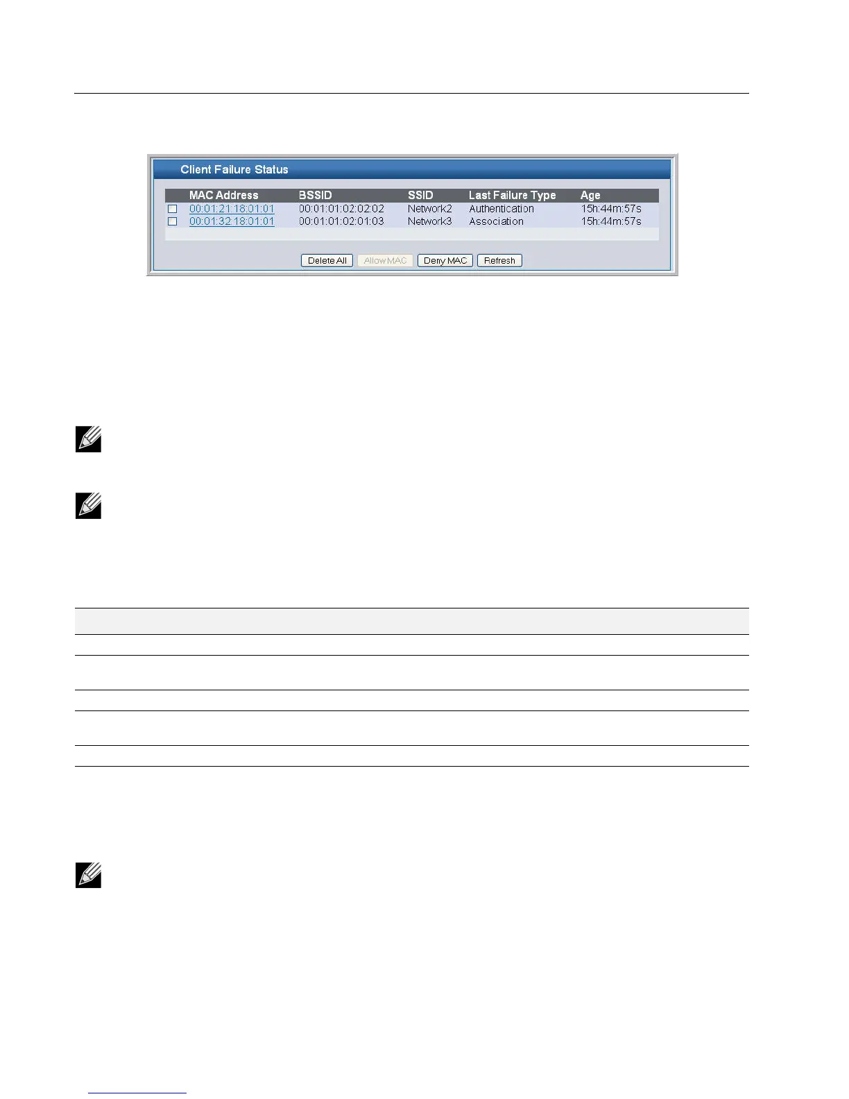 • To block a failed client from WLAN access, select the check box next to the MAC address of the client and click Deny
