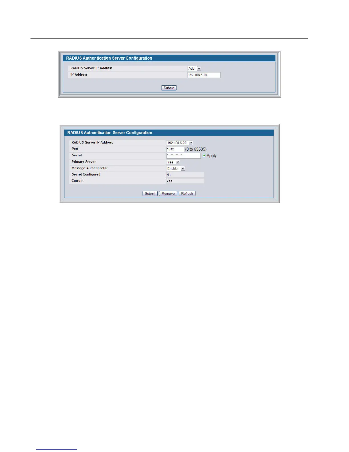5 Configure information that the Unified Switch must use to contact the RADIUS server on your network, such as the