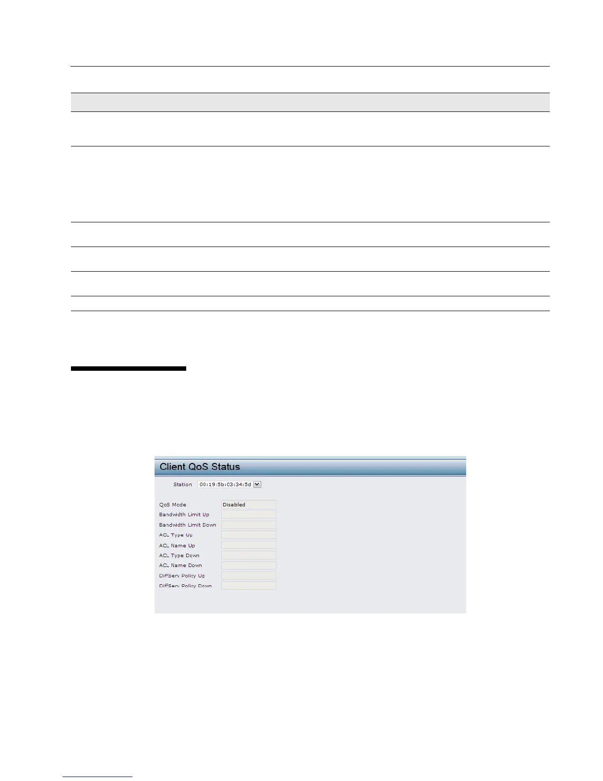 The Client QoS Status page shows the client QoS settings that are applied to each client currently associated with the AP.