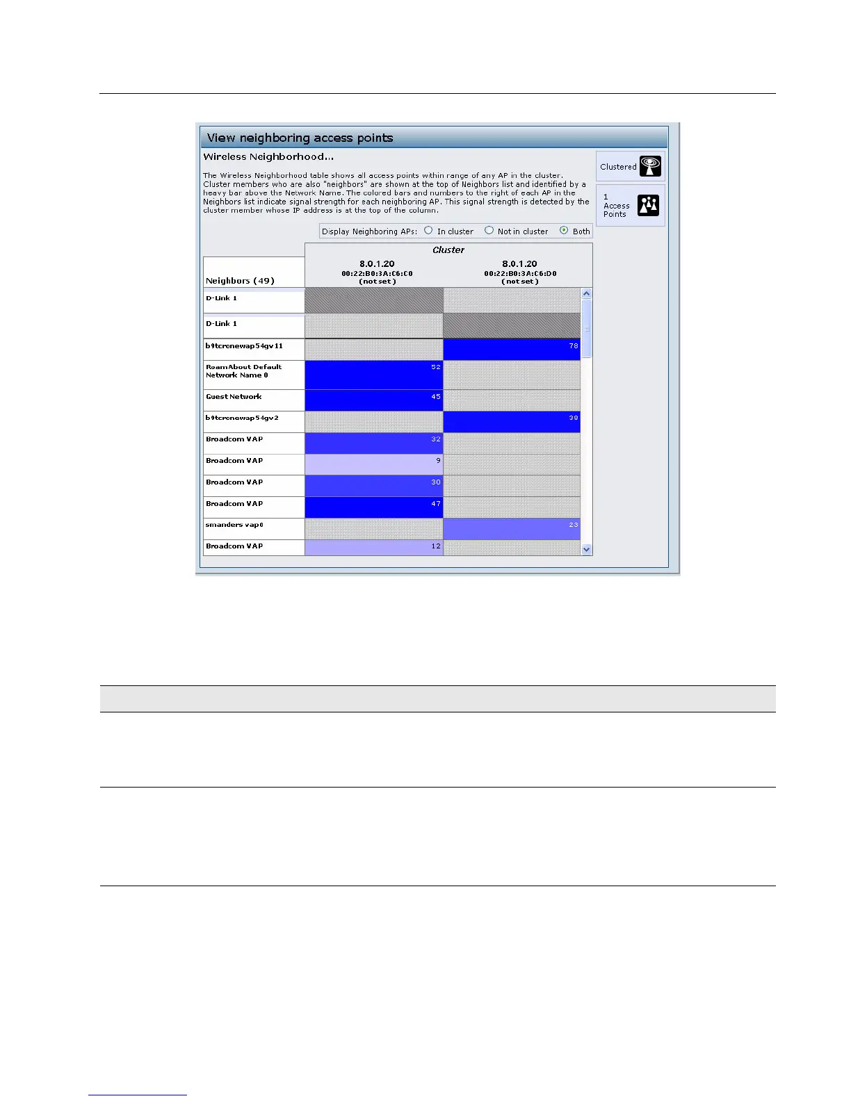 Cluster The Cluster list at the top of the table shows IP addresses for all access points in the