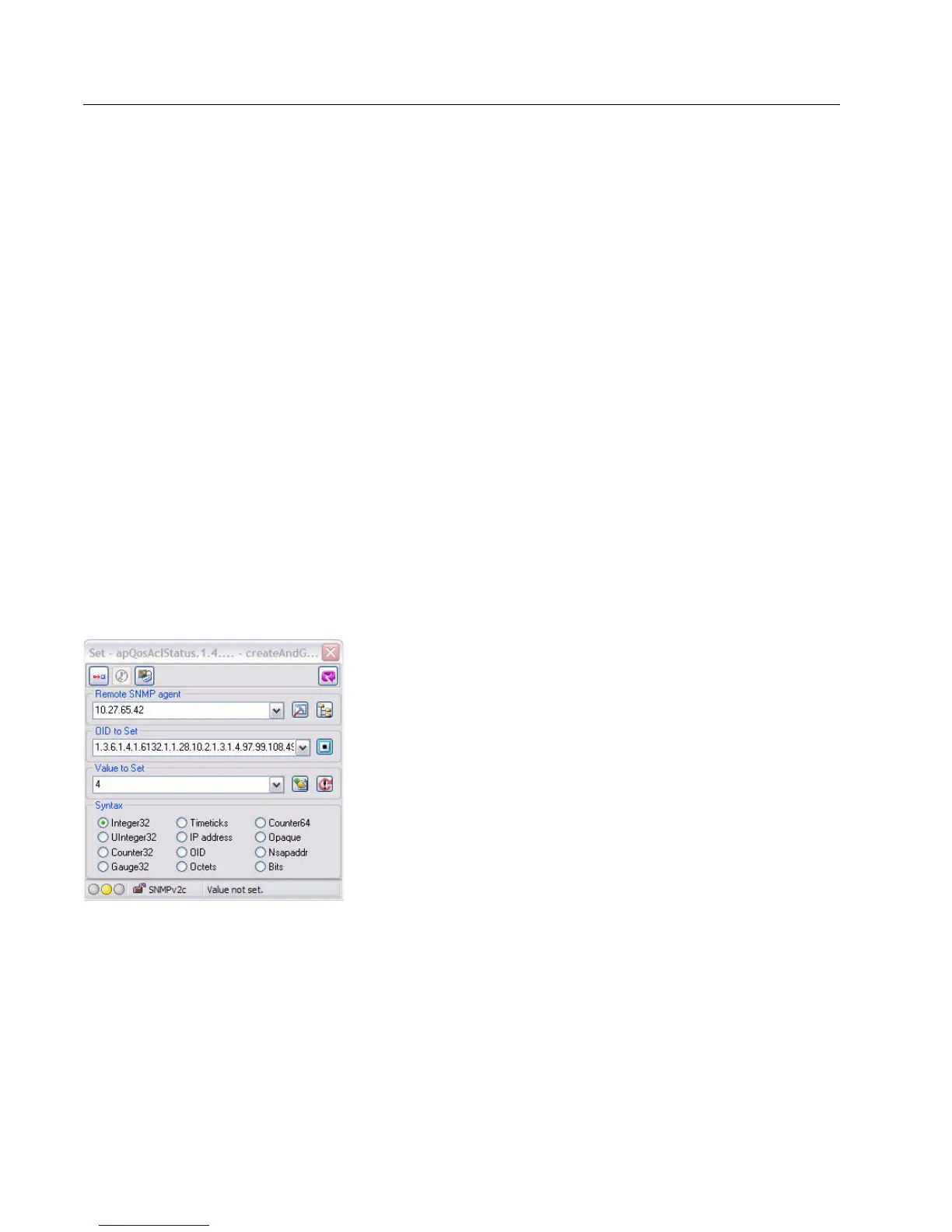 • Use 1.3.6.1.4.1.6132.1.1.28.10.3.1.14.1.4.97.99.108.49.1 to set the apQosAclRuleStatus of Rule 1 to active (1)