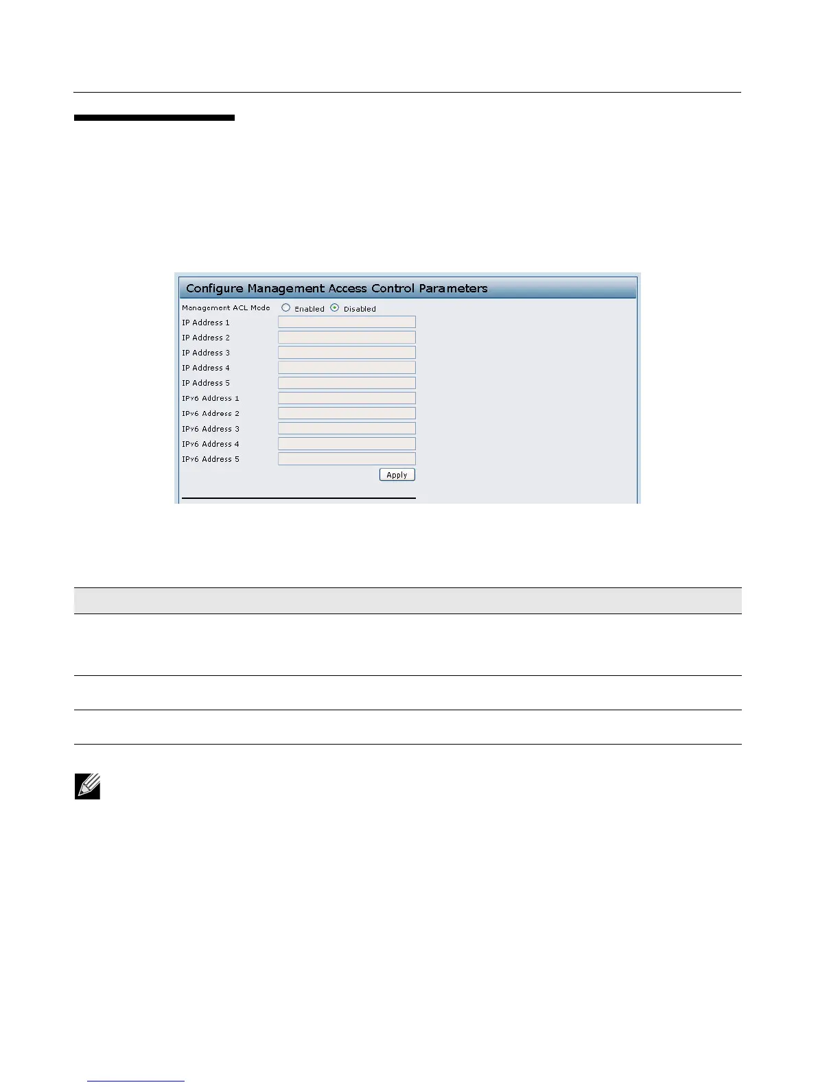 Management ACL Mode Enable or disable the management ACL feature. At least one IPv4 or IPv6 address