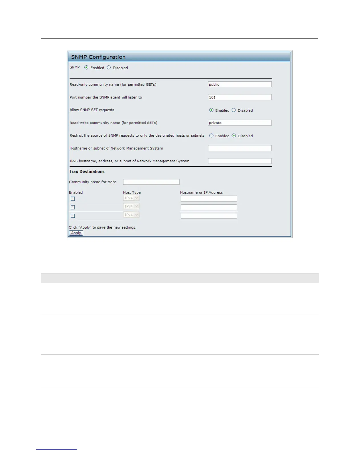 Note: If you disable SNMP, all remaining fields on the SNMP page are is disabled. This is a