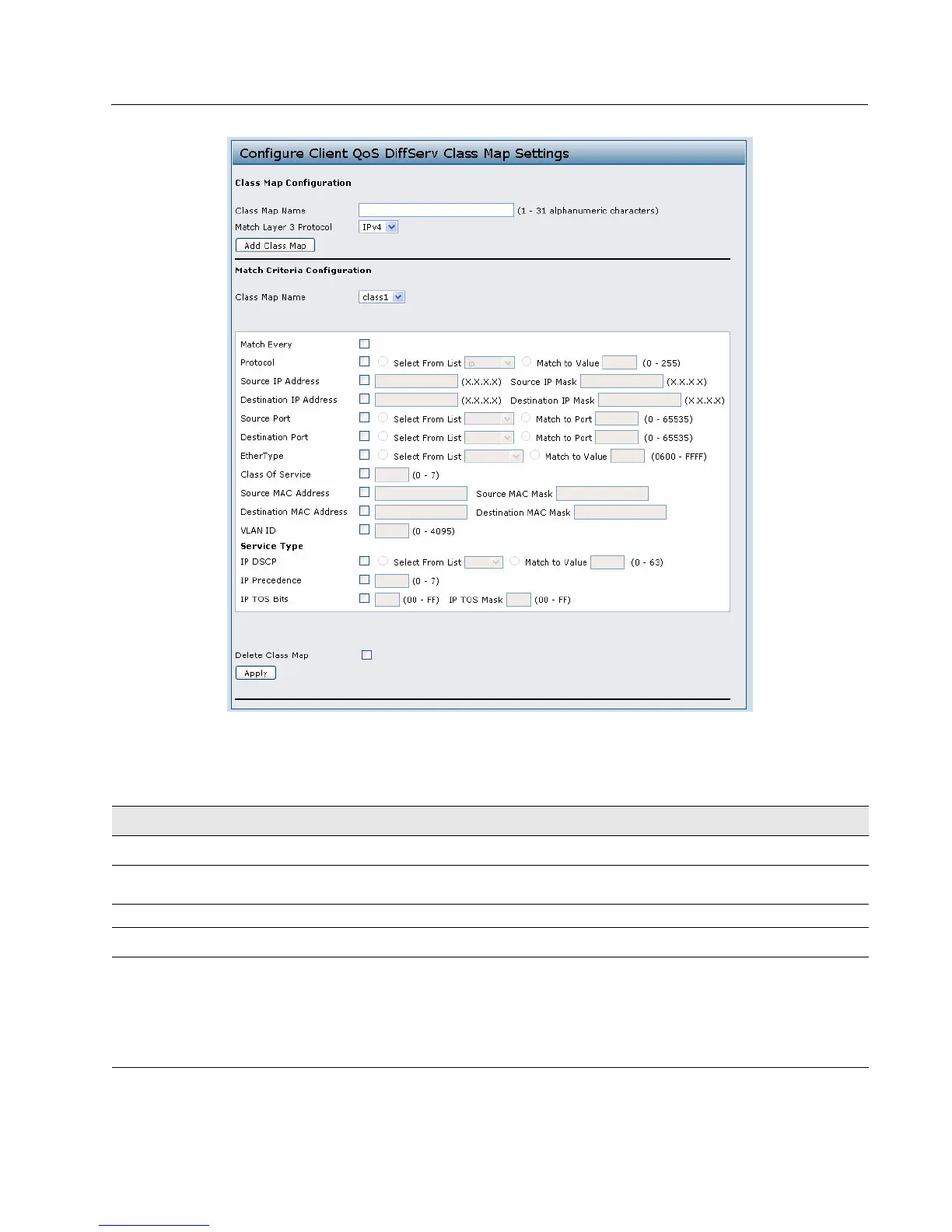 Use the fields in the Match Criteria Configuration area to match packets to a class.