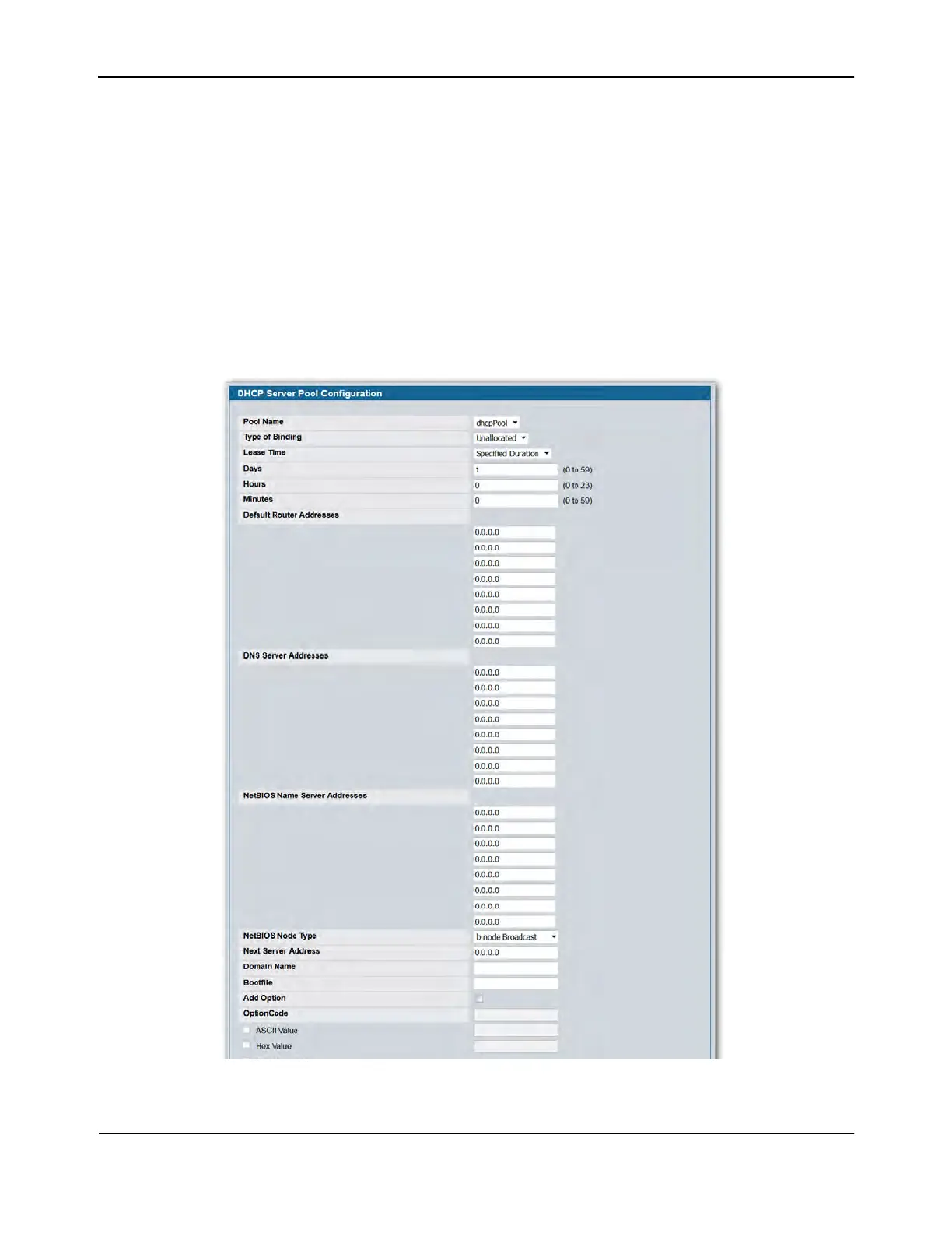 Use the DHCP Pool Configuration page to create the pools of addresses that can be assigned by the server.