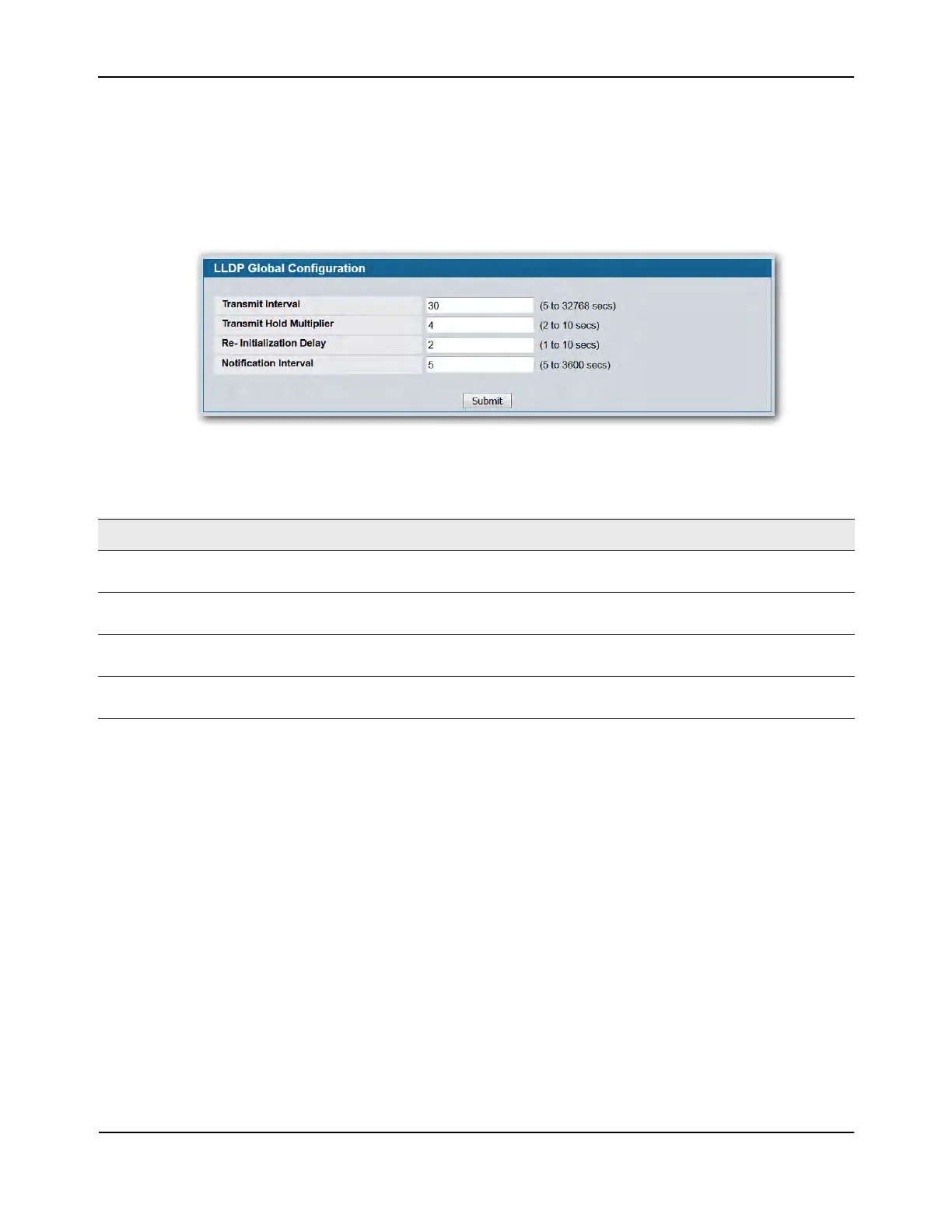 Transmit Interval Specifies the interval at which LLDP frames are transmitted. The default is 30