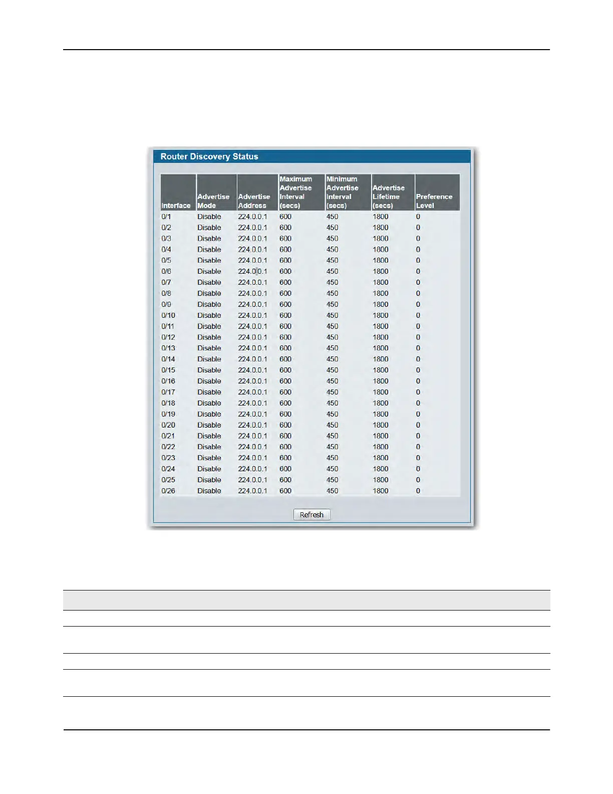 To display the page, click LAN > L3 Features > Router Discovery > Status in the navigation tree.