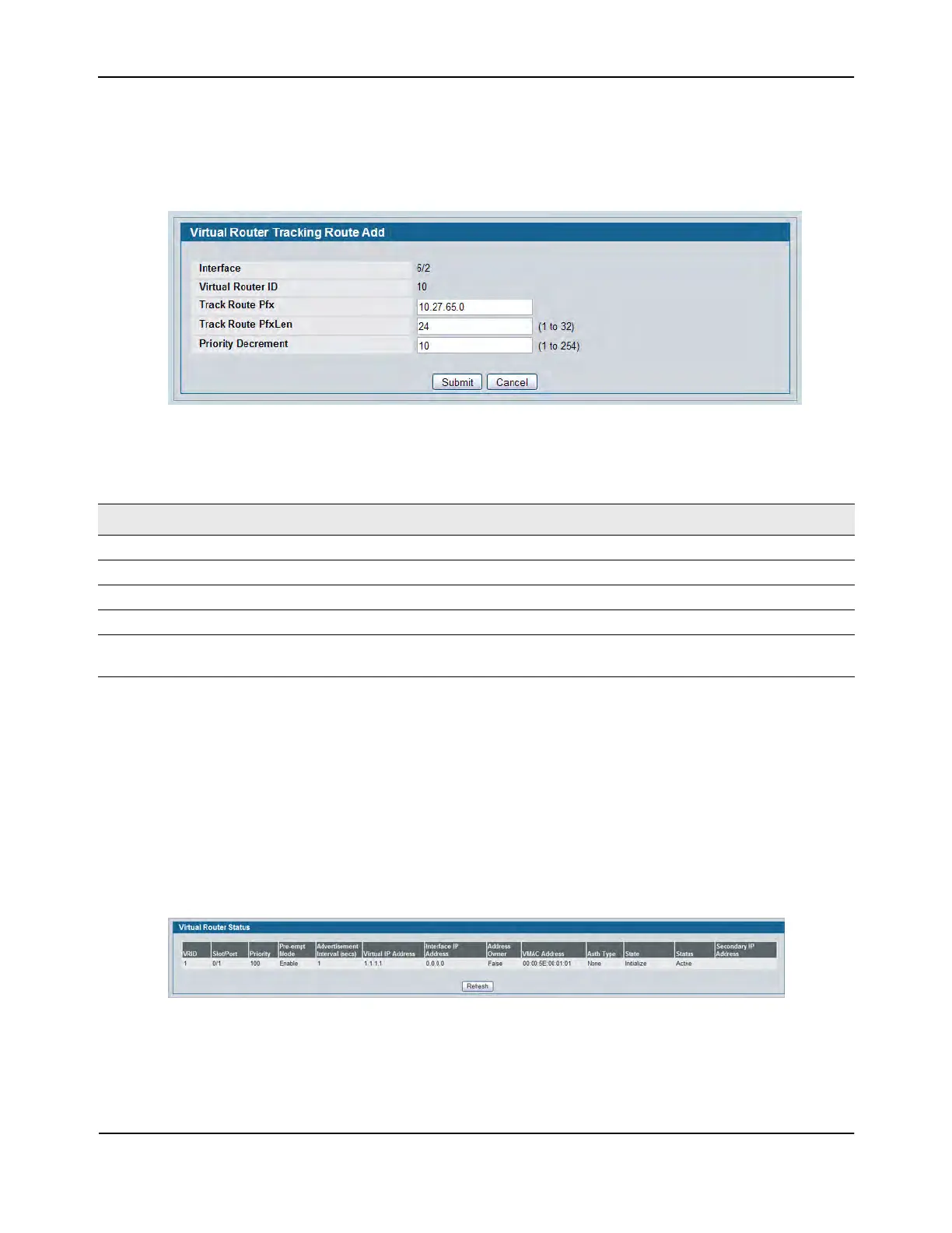 Use the VRRP Route Tracking page to add a route into the tracking list. To access this page, click Add from the